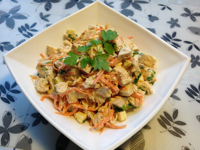Морковь по-корейски возможно применять как независимую закуску. Но в сочетании с мясом курицы, и шампиньонами получается неимоверно вкусный и остренький салат.Ингредиенты: