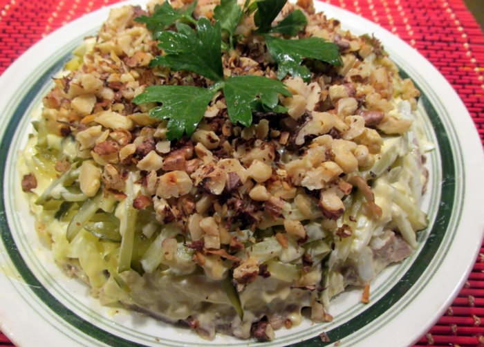 - Ингредиенты можно смешать или выложить слоями по своему усмотрению. Заправить соусом тартар. Украсить измельченными грецкими орехами и свежим огурцом.