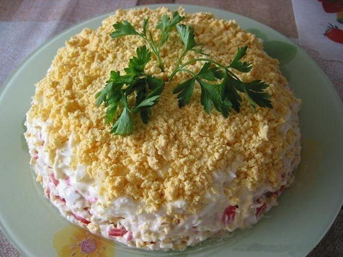 - Яйца сварите вкрутую, остудите, очистите. Отделите белки от желтков. На крабовые палочки потрите на мелкую терку желтки, а затем сверху белки. Украсьте салат по желанию и подавайте на стол.