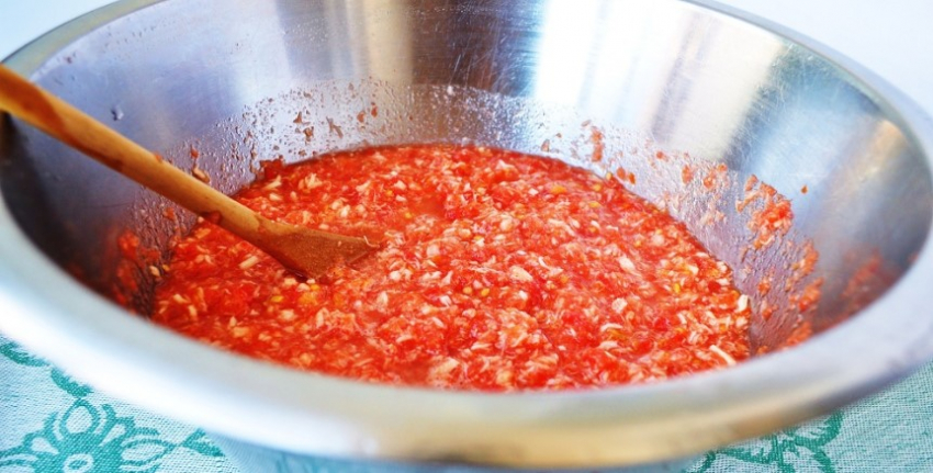 - Хрен обмываем, чистим. Измельчаем на мясорубке перец, томаты, хрен и очищенный чеснок.