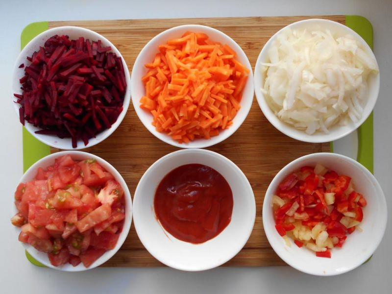 Необыкновенным вкус борща сделает сладкий болгарский перец. Его возможно использовать и при заготовке супа к зиме. Допускается применять как красный, аналогично и желтый перец.Ингредиенты