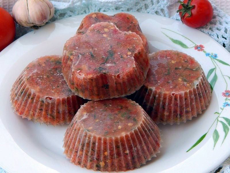 - Поутру извлеките замороженную заготовку из формочек, уложите в тугой пакет и уберите на постоянное сохранение до зимы. В принципе, если вам комфортнее хранить эту заготовку в формочках, возможно в них и оставить. Единственное что, мы бы советовали обернуть каждую формочку пищевой пленкой, для того, чтобы избежать примеси сторонних запахов.