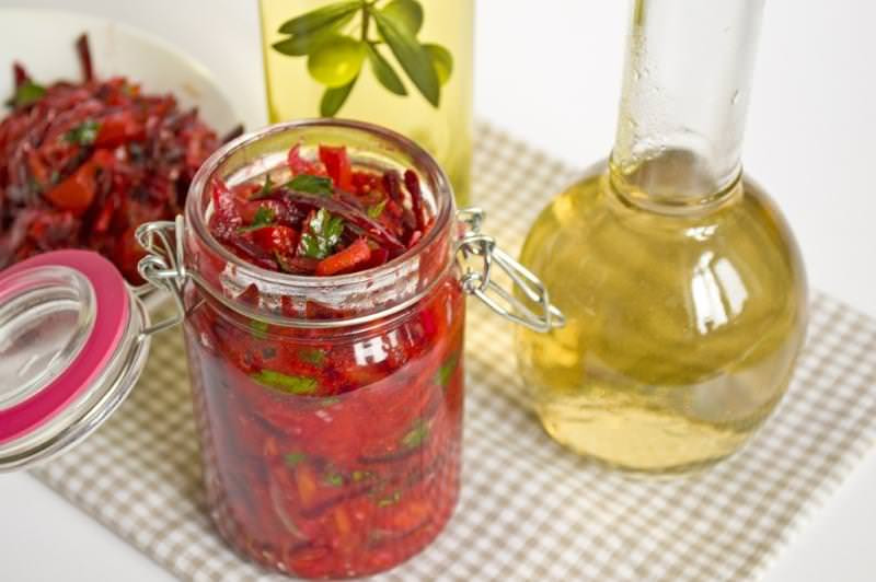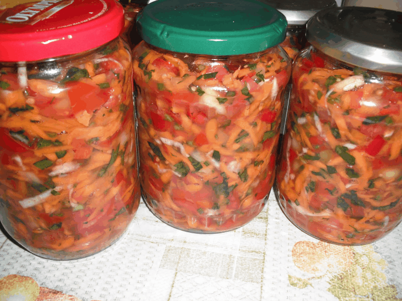 После предварительного дробления абсолютно все овощи (кроме перца) помещаются в чугунную кастрюлю, заливаются маслом, затем тушатся до пластичности. Примерно через двадцать пять-тридцать минут к ним подливается вода, и компоненты доводятся до закипания. После укладывания болгарского перчика операция снова повторяется. После еще одного закипания можно прибавлять в кастрюлю уксус, сахарный песок, а также соль. Масса тушится на тихом огне еще двадцать пять минут. В самую финальную очередь в емкость закладывается размельченная петрушка, и жидкость вновь доводится до закипания. Осталось в теплом виде перелить грядущую заправку в банки и закатать.
