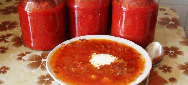 Томаты перекручивают на мясорубке, обчистив плоды по желанию заранее от шкурок. Варят полученный томат тридцать минут. Солят массу по вкусу, прибавляют по желанию чеснок, нагревают еще 5 минут. Закупоривают борщ на зиму в кипяченые банки, тепло кутают на сутки.