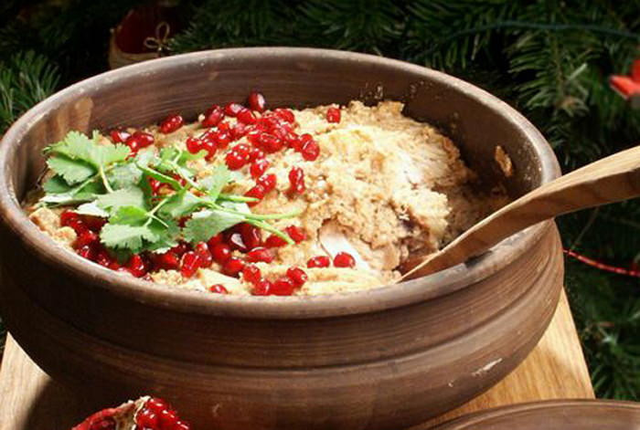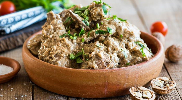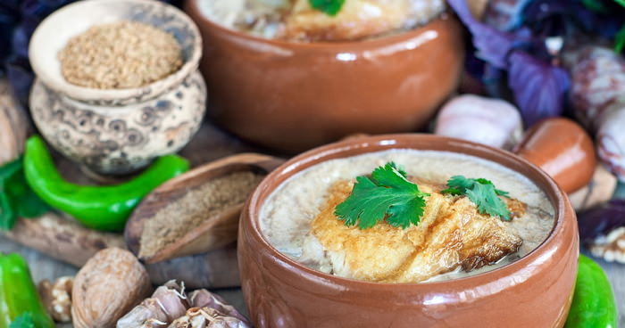 Сациви – это и грузинский соус, и холодное блюдо из курицы или индейки под этим соусом. Главные ингредиенты сациви – грецкие орехи и курица. Для приготовления соуса необходима не сама птица, а бульон, в котором она отваривалась. Конечно, в лучших грузинских традициях основные продукты дополнены пышными букетами трав и специй.