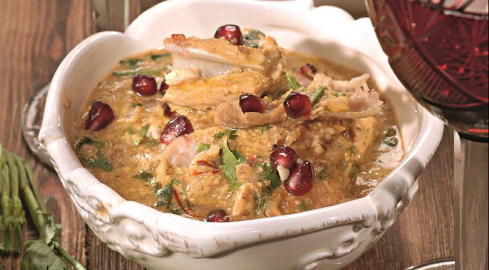 - Посыпаем сациви зернами граната и листиками свежей кинзы, подаем к столу не разогревая, холодным.