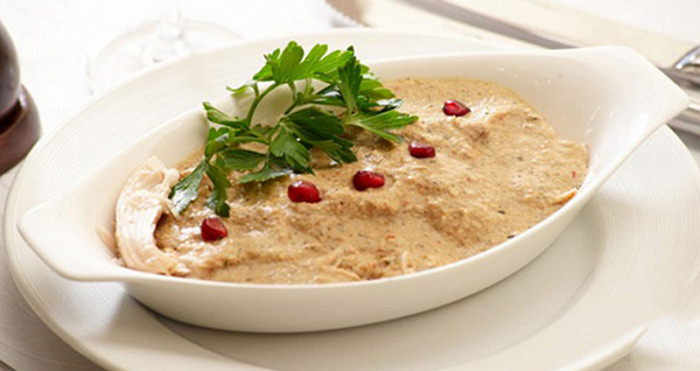 - В пропущенные через мясорубку орехи подливаем понемногу бульон и перемешиваем до консистенции сметаны. Чтобы соус получился нежным, протрем орехово-бульонную массу через мелкое сито. Добавляем специи с уксусом в ореховую массу.