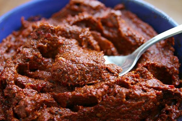 Кавказцы обожают грецкие орехи, они кладут их не только в сладкие блюда, но и в мясо и овощи. Грех, не улучшить вкус аджики. 100 г грецких орехов прокручиваем с другими ингредиентами. Получается густая, ароматная масса, надо оставить ее на несколько часов в теплом месте до полного растворения соли.