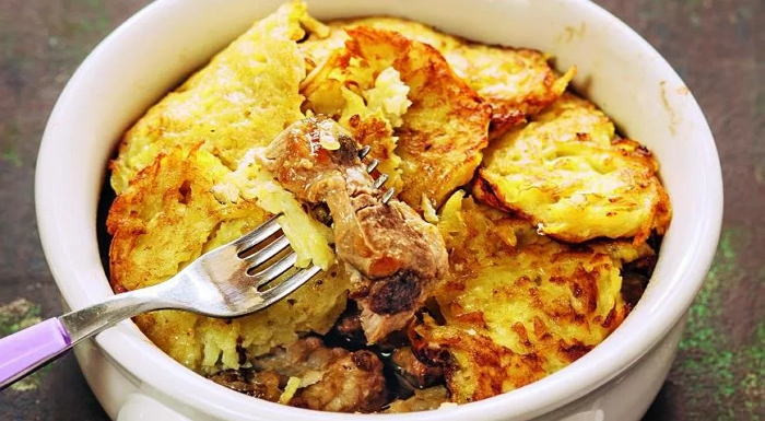 - Смажьте горшочки, положите по кусочку сливочного масла в каждый горшочек, выложите слой драников, сверху мясной соус и повторите слои. Поставьте горшочки на полчаса в разогретую духовку на полчаса.