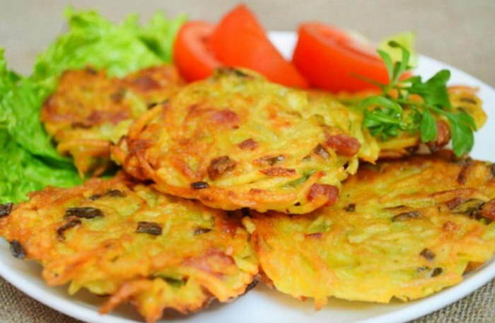 - Первым делом следует очистить картошку, затем натрите картофель на мелкой терке, добавьте яйцо, муку, соль, черный перец, щепотку соду, перемешайте, обжарьте оладьи.