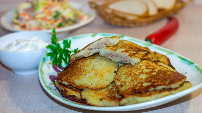 - Важно не делать высоких драников с мясом – они могут просто не прожариться. Жарим на небольшом огне с двух сторон до появления уверенной золотистой корочки.