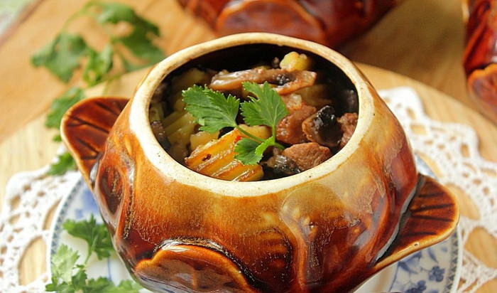 - Доведём до кипения и потомим 2 минуты. Посолим по вкусу, можно добавить щепотку сахара. Обжаренные кусочки кролика отправляем в форму, пригодную для духовки, у меня – глиняный горшок.