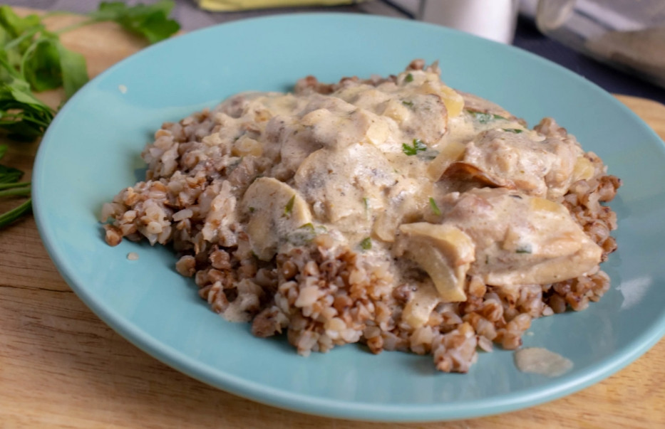 Гречка с острой курицей и шампиньонами в сливках
