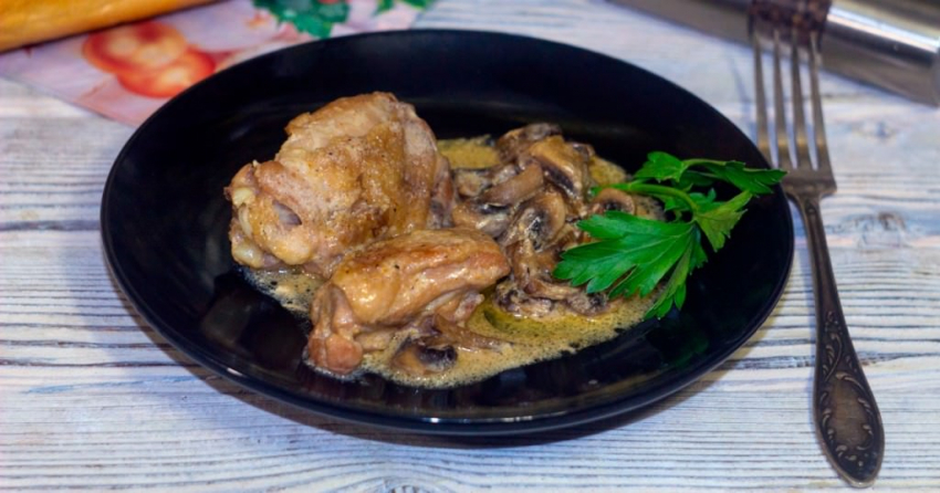 Если вы используете шампиньоны и горошек, то теперь можно добавить их и сливки. Томим фрикасе на среднем или слабом огне до готовности крольчатины и шампиньонов (минут 10-15).