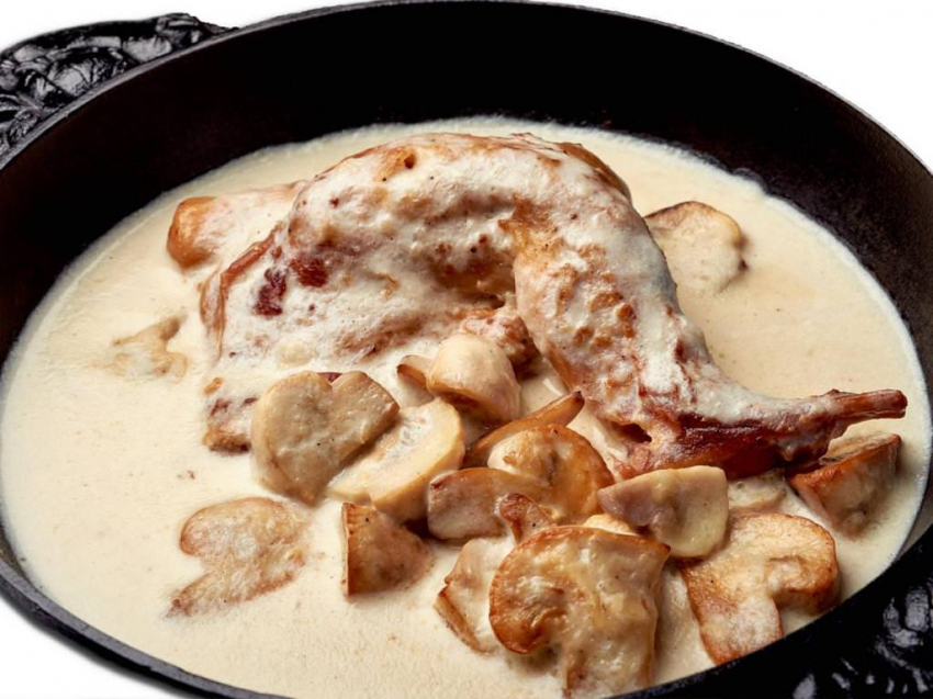 - Кастрюлю с мясом поставьте на огонь ниже среднего, залейте готовым сметанным соусом. Тушите блюдо, примерно 1 час, в конечном итоге мясо кролика должно явно легко отделяться от кости. При необходимости доливайте в кастрюлю тёплую воду.