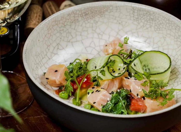 - Разложите севиче по глубоким мискам или тарелкам, полив оставшимся «тигриным молоком», украсив листиками кинзы, посыпав рублеными орешками и приправив свежемолотым чёрным перцем.