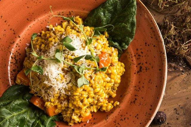 - Подавать перлотто с утиной грудкой, украсив ростками редиса и листиками базилика.
