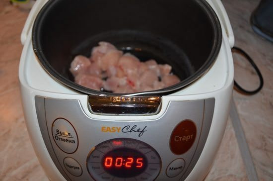 - Курицу нарубите мелкими кусками.