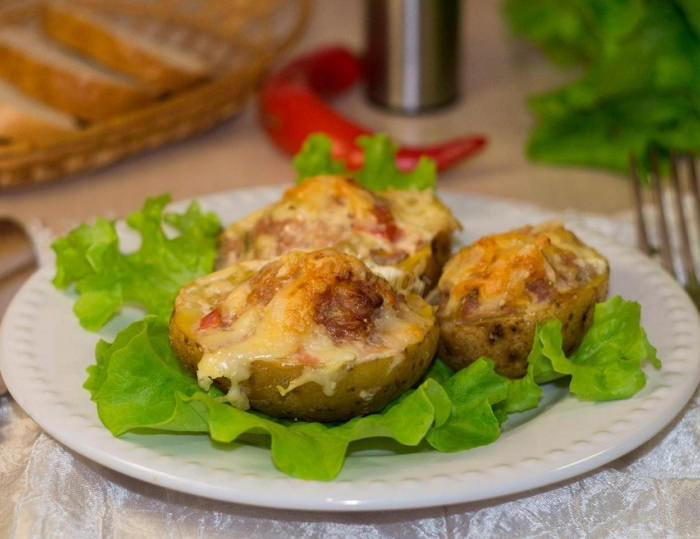 - Вспрысните кожуру маслом, поставьте обратно в духовку на 5 минут, затем наполните заготовки начинкой, посыпьте тертым сыром.