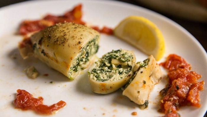 - Кальмары помыть и дать подсохнуть. Все продукты для фарша измельчить в блендере. Нафаршировать кальмары и выложить на противень. Кисточкой смазать кальмары оливковым маслом.