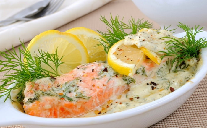 - Выложить в массу морепродукты и нагреть до кипения. Достать стейки семги из духовки, залить полученным соусом из морепродуктов и выпекать при температуре 180 градусов 7-10 минут.