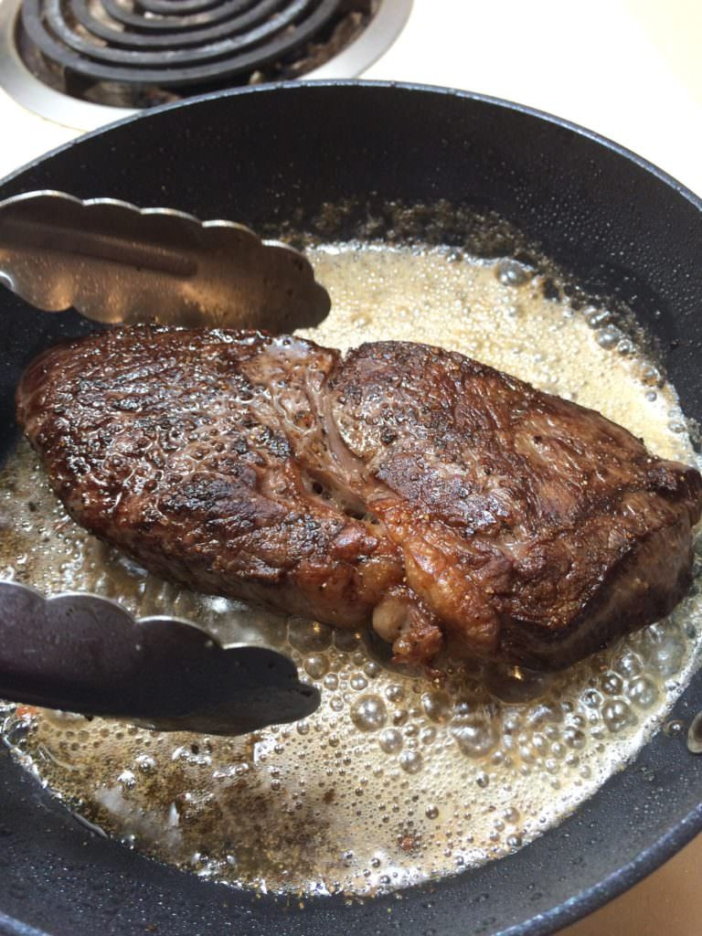 После того как минута прошла поверните стейк боком, для обжарки края. Держите так пока край не окрасится также как остальная часть мяса. Сделайте это с обеих сторон. Наклоните сковороду так, чтобы масло скопилось с одной стороны сковороды, так будет удобнее обжаривать края стейка. Как на фотографии выше.