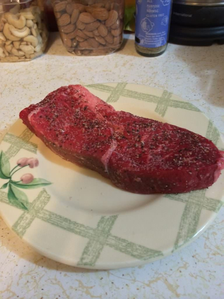 Во-первых, распакуйте мясо и дайте ему полежать на тарелке. Пока оно лежит используйте соль и перец для приправки стейка. Обсыпьте со всех сторон, не жалейте приправ.