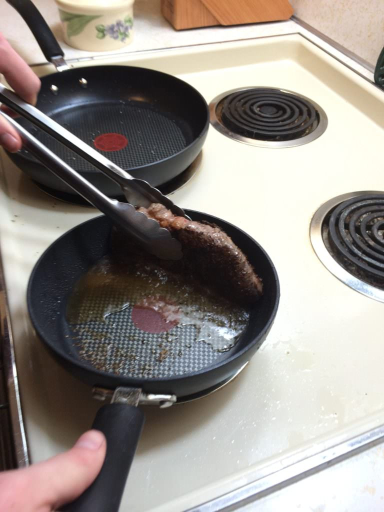 Следующий шаг является очень важным и может быть опасным. На данный момент, сковорода должна быть очень горячей. Вы будете использовать щипцы, чтобы поместить стейк в горячее масло. При таких высоких температурах будет много брызг так что будьте осторожны при переворачивании стейка.