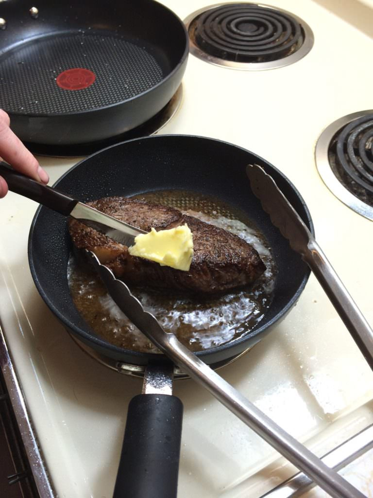 Настало время добавить чеснок и масло. Отрежьте хороший кусок сливочного масла и поместите его на сковородку щедро сдобрив все это чесноком. Я использовал чесночный порошок, так как под рукой не оказалось свежего. Продолжая переворачивать стейк, позвольте мясу впитать весь этот благостный вкус. Имейте в виду что я описываю как сделать идеальный стейк, а не здоровый.