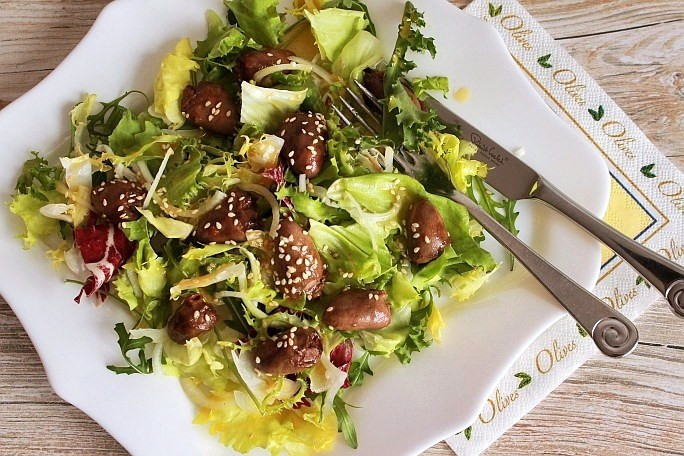 Смешайте сухое вино с соевым соусом и медом и замаринуйте куриные сердечки. Через 40 минут пожарьте куриные сердечки на половине оливкового масла. Листья салата уложите на блюдо, на них — куриные сердечки. Мелко порежьте чеснок и острый перец, добавьте в салат. Заправьте соком лимона и оливковым маслом, посыпьте орехами.
