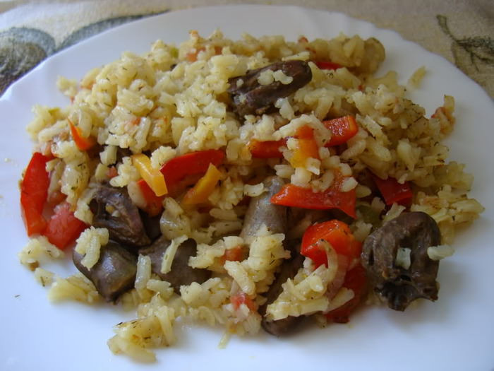 Хорошо промойте рис холодной водой и откиньте его на сито. Куриные сердечки обжарьте на растительном масле, посолите, поперчите. Нарежьте морковь соломкой, помидоры – кружочками и смешайте все овощи с сердечками. В почти готовое блюдо насыпьте рис и залейте его водой. Через 20 минут ваш шедевр готов. Добавьте в него красный перец и украсьте зеленью.