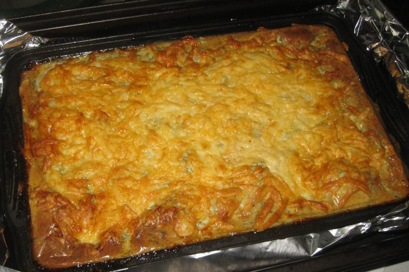 Ставим в разогретую до 190-200 градусов духовку примерно на 40 минут. За 15-20 минут до готовности достаем запеканку и посыпаем ее тертым сыром. Затем отправляем обратно в духовку допекать. Сыр должен слегка зарумяниться сверху.