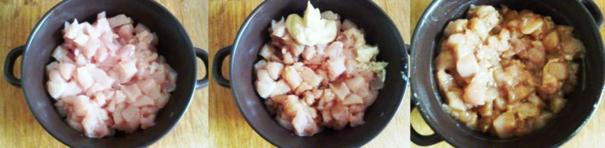 куриное филе – 300-400 г лук – 1 больш сметана – 300 г яйца – 2 штуки мука – 1 ч. л. горчица – 1 ст. л. соевый соус – ст. л. (по желанию) чеснок – 1 зубчик твердый сыр – 50-70-100 г (по желанию) соль, специи по вкусу растительное масло немного зелени Сначала подготовим куриное мясо, слегка замаринуєем его и дадим настояться. Режем куриное филе на мелкие кусочки. Добавляем горчицу, соевый соус, измельченный чеснок, соль и перец по вкусу. Перемешиваем и отставляем, пусть маринуется.