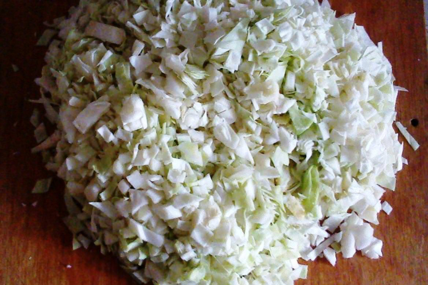 Ставим на плиту кастрюлю с водой, примерно 2 литра и доводим до кипения. Пока вода греется, шинкуем капусту. Резать ее можно как угодно.