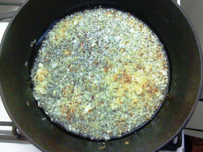 Лук режем мелкими кубиками и обжариваем на растительном масле до легкого золотистого цвета.