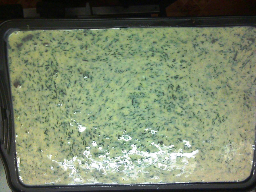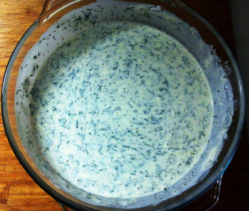 Пока жарится лук, готовим заливку. Взбиваем в миске 2 яйца, добавляем сметану, соль, молотый черный перец и любые специи и сухие травки, которым отдаете предпочтение. Можно добавить свежий мелко нарезанный укроп, его вкус прекрасно сочетается со вкусом капусты и курицы. Все перемешиваем, затем добавляем полную чайную ложку муки и еще раз перемешиваем, чтобы не было комочков. С таким соусом капустная запеканка приобретет приятный аромат специй.
