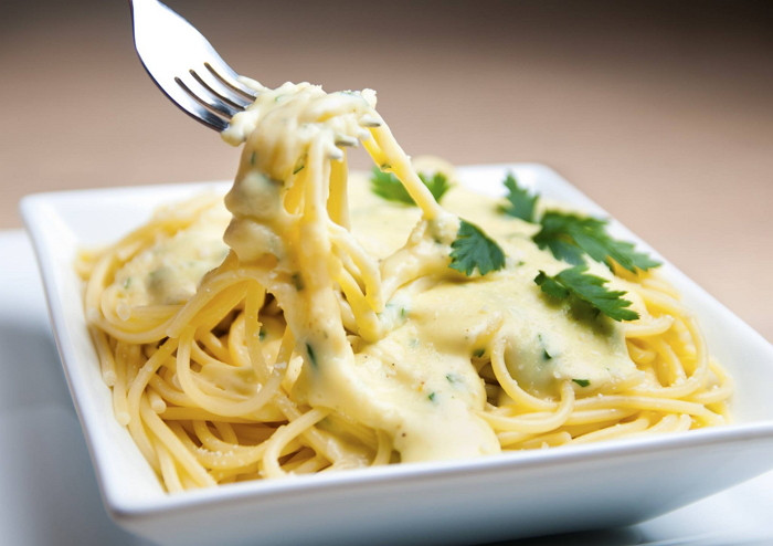 - Добавляем сырный соус к макаронам. Вылейте соус на пасту и перемешайте блюдо. Запекаем макароны с сыром в духовке. Если вы решили запечь макароны с сыром, то переложите их в форму для выпечки, смазанную маслом, и разровняйте. Время запекания – 10-15 минут, а если точнее, то до образования пузырьков и золотистого цвета.