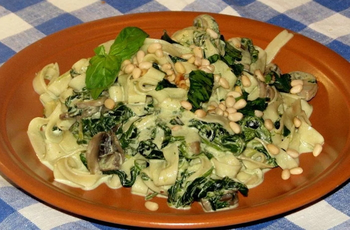 - Добавьте в сковороду макароны, нарезанный перец, листья шпината и ломтики грибов. Через 3–4 минуты снимите с огня.