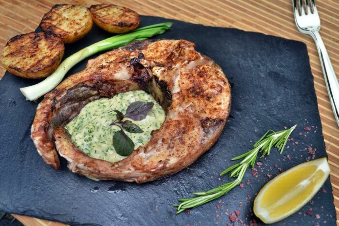 - Натереть стейки солью и сбрызнуть лимонным соком, переложить в миску, оставить на полчаса (до подгорания углей).