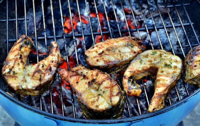 - Выложите кусочки амура на решетку и, переворачивая каждые две минуты, варите не более четверти часа.