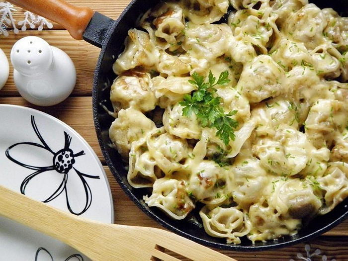 В данном блюде основополагающим ингредиентом являются, конечно, пельмени-полуфабрикаты. Чудесно, если вы сами – любитель лепить пельмени и ваша морозилка ими забита (при желании можете воспользоваться советами как приготовить домашние пельмени, или если в Сибири у вас живет бабушка, которая килограммами шлет вам замороженные домашние пельмешки, сделанные по особому рецепту. Если же нет, то для того, чтобы приготовить это блюдо, нам с вами придется отправиться в ближайший супермаркет.
