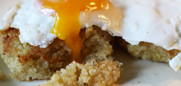 Весь фокус в том, чтобы яичница, положенная поверх котлеток, могла залить их желтком, который начнет пропитывать волшебные шарики киноа, сообщая им свой вкус.