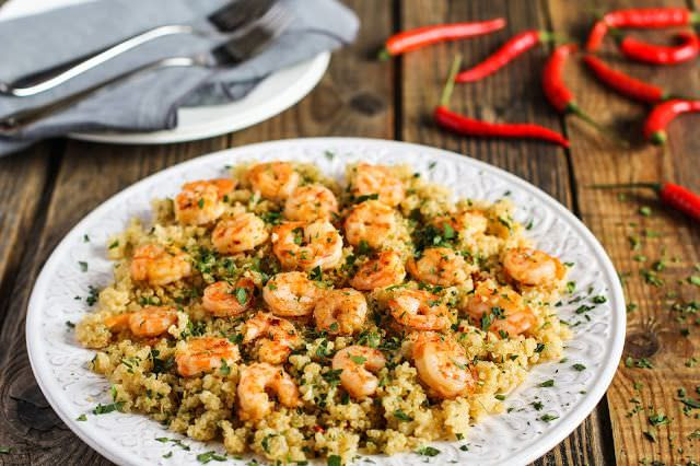 Совет. Соотношение киноа и воды (или бульона) 1:2 – на одну часть крупы две части воды.В процессе приготовления киноа увеличивается в объеме в 4 раза. Переложить киноа в миску и смешать с соусом “Песто”. Выложить на сервировочное блюдо и подать с креветками.