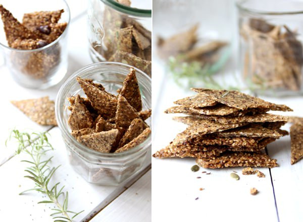 Противень застелить пергаментной бумагой. Тесто раскатать тонким слоем. Можно посыпать орехами, пряностями или травами по вкусу*. Нарезать ножом порционно, чтобы удобно было ломать. Накрыть еще одним листом пергамента и запекать около 30 минут при 175С, пока тесто не станет золотистым и хрустящим. Дать остыть и разделить на кусочки по линиям. Хранить в пластиковом контейнере.