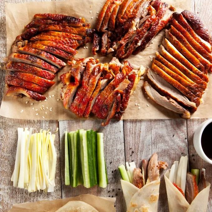 - Подача блюда заслуживает особого внимания. Китайские повара из одной утки нарезают 108 небольших тонких кусочков. Подается это блюдо по-разному. Так, мясо можно завернуть в тончайшие блинчики, которые может заменить тонкий лаваш. Предварительно его необходимо обмазать соусом хойсин.