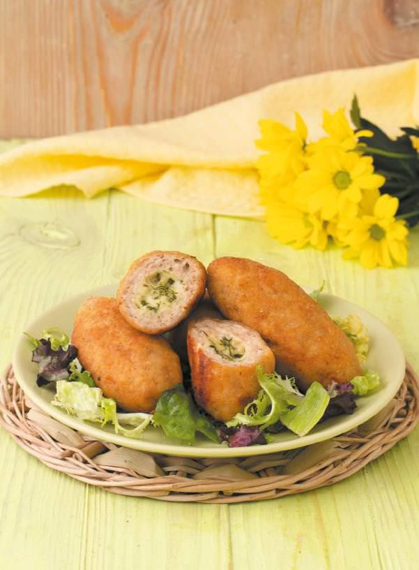 Замочить хлеб в воде или молоке. Пропустить мякоть птицы и отжатый хлеб через мясорубку. Добавить соль, приправу, хорошо вымесить фарш. Мелко порубить зелень. Натереть сыр, смешать со сливочным маслом и рубленой зеленью. Сформовать котлеты, положив внутрь сырную начинку. Обвалять котлеты в панировочных сухарях. Обмакнуть котлеты в яйцо. Затем вновь обвалять в сухарях. Обжаривать в растительном масле 3–5 мин. Доводить 5–8 мин до готовности в духовом шкафу при 160 °С.