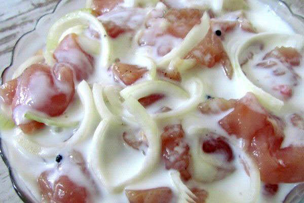 - Теперь полностью заливаем мясо кефиром, перемешиваем, накрываем крышкой и оставляем мариноваться на холоде в течении минимум 6 часов. Если совершить это раньше, она станет жесткой.