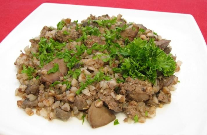 - Добавить гречку, перемешать, поперчить, если необходимо, посолить. Убрать с огня. При подаче посыпать зеленью.