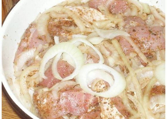 Аккуратно перемешать, чтобы не повредить кольца лука. Оставить на холоде в течение 4-6 часов, лучше на ночь. Перед нанизыванием замаринованную массу обязательно извлечь и оставить при комнатной температуре на 1,5-2 часа, так как холодные кусочки мяса не принято обжаривать – они приготовятся по краям, а внутри останутся сырыми. Насадить кусочки маринованного мяса на шампура попеременно с кольцами репчатого лука. Обжарить на мангале, на раскаленных углях в течение 15-20 минут. Обязательно следить за жаром, если необходимо – поднимать или опускать шампура с шашлыками, чтобы мясо прожаривалось равномерно. Влить в оставшийся маринад 100 мл воды и время от времени поливать им шашлыки, чтобы они не стали сухими в процессе жарки.