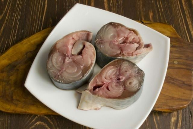 Стейки из тунца размораживаем на нижней полке холодильного отделения. Если вы готовите из целой рыбы, то отрежьте от тушки куски шириной примерно 2 сантиметра.